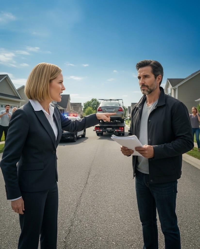 Tow chains locked tight around the frame. Hydraulics whining with that low mechanical sound that always feels more serious than it should. The front wheels hung inches above the concrete, tilted just enough to make it clear—someone had already decided this was happening.