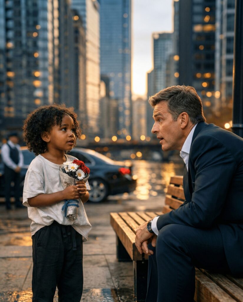 The little girl standing in front of him tightened her grip on the bouquet she was holding—white daisies threaded with two red carnations, their stems wrapped in folded newspaper and tied carefully with a strip of blue yarn. Her voice had been soft when she spoke, but not careless. It carried the deliberate politeness of a child taught to respect adults even while asking for something enormous.