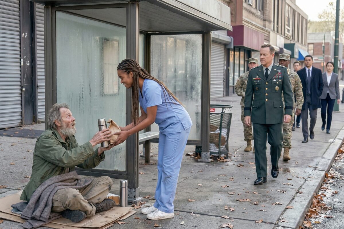 She showed up every morning. No cameras. No audience. Just kindness. At the same quiet bus stop, Aaliyah brings breakfast to an old man everyone else walks past. Day after day. No questions asked. Even when she has little to spare. Then one morning… he’s gone. No goodbye. No explanation. Just silence. Weeks later, there’s a knock at her door. Not neighbors. Not friends. Military officers. What they ask—and what they reveal—turns a simple act of compassion into something far bigger than she ever imagined.