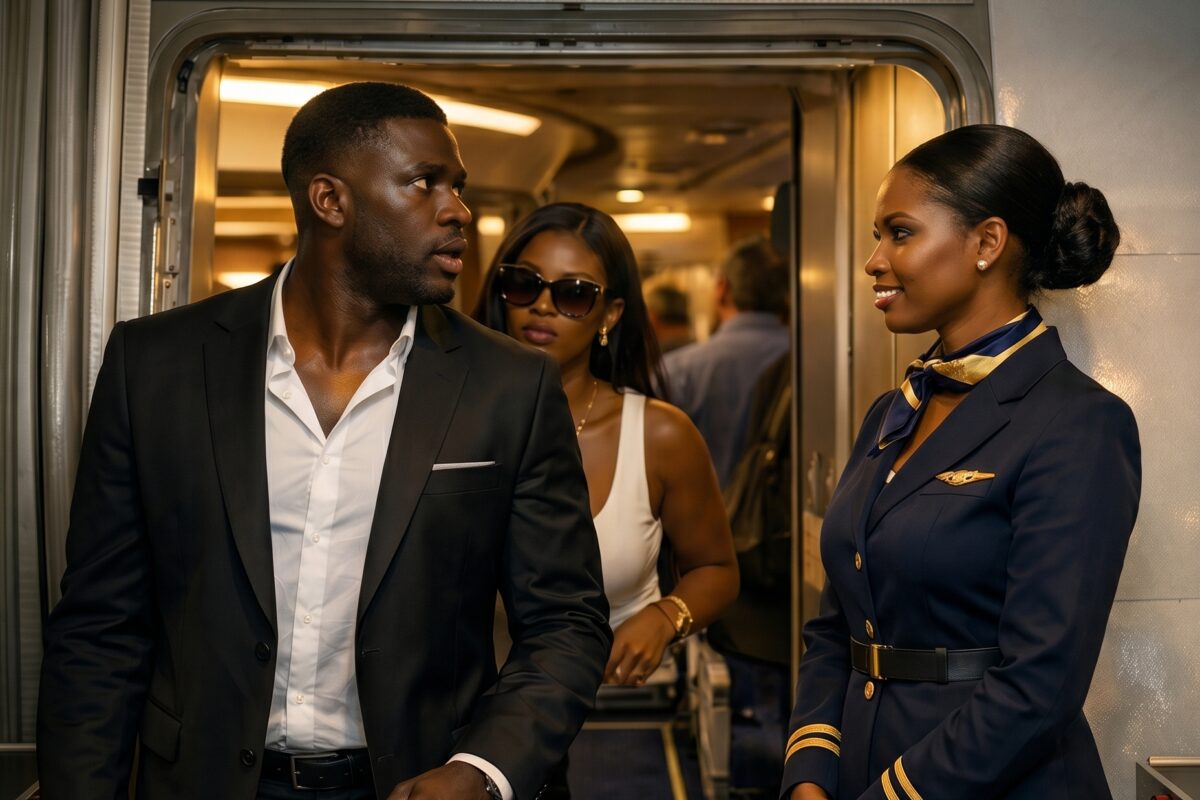 He thought no one would find out. He thought this flight was just another secret. “Welcome onboard, Mr. and Mrs…” The words land—and everything changes. In a first-class cabin built on quiet luxury, one introduction freezes a man in place. His confidence disappears. His story unravels before he can even speak. The woman beside him notices. The tension spreads. Then the truth steps forward. “I’m his wife.” No shouting. No chaos. Just silence—heavy, undeniable, impossible to escape.