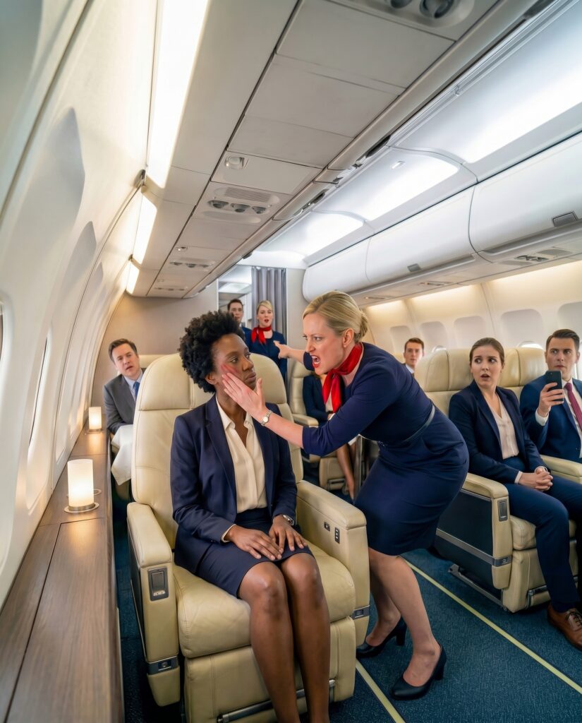 They walked down the jetway together and stepped into a cabin designed to sell calm. Four rows of broad leather seats. White linen napkins. Champagne flutes already waiting in the overhead glow. Soft jazz filtering through the speakers. Standing at the entrance, greeting passengers with a polished smile, was Brenda Nolan, senior flight attendant, twelve-year veteran of Skybridge Airlines.